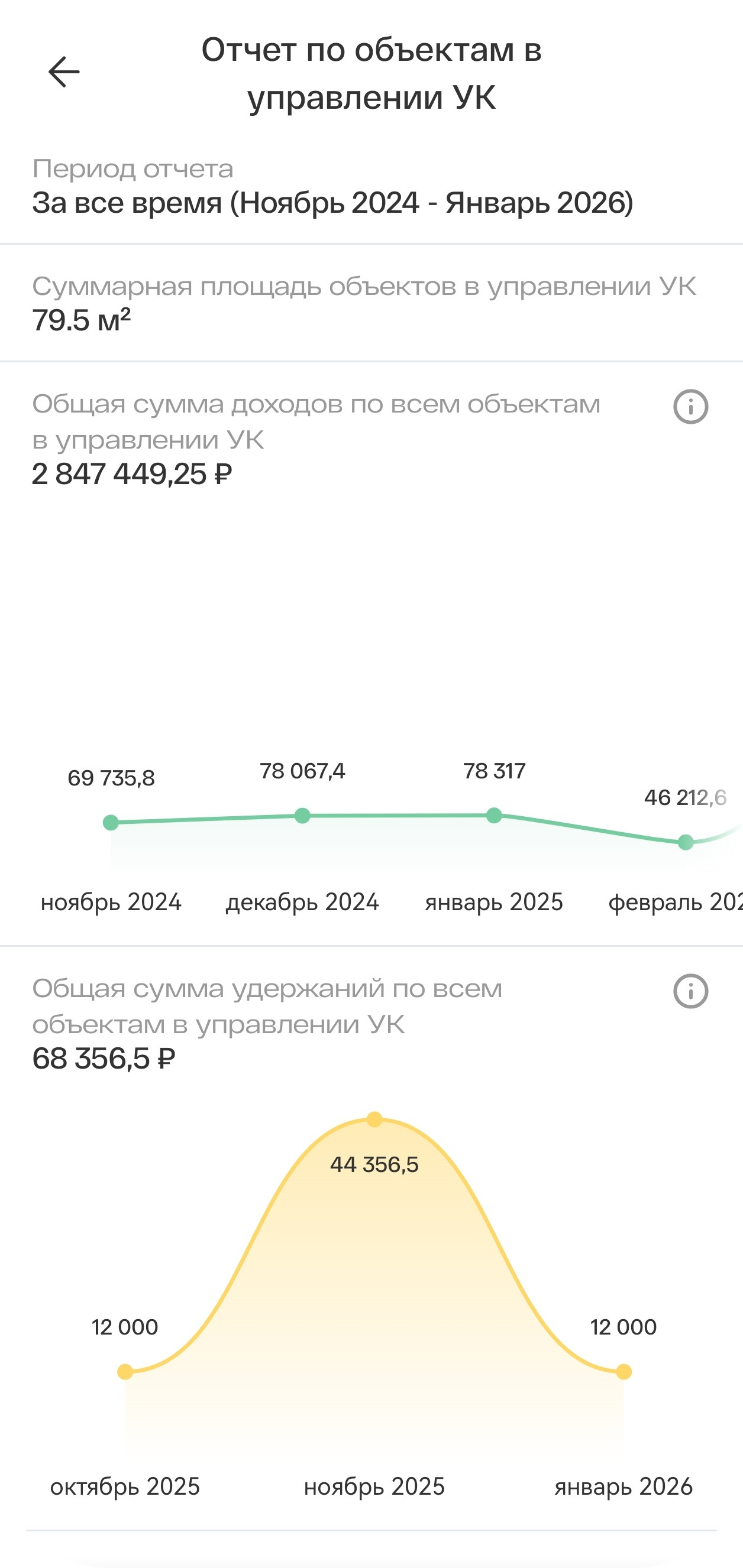 В разделе «Отчёты» можно построить сводку по всем объектам — за конкретный месяц, произвольный период или за всё время с момента заключения договора. А если нужны данные по конкретным помещениям, просто выберите нужные объекты и интересующий промежуток времени.